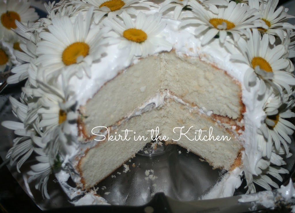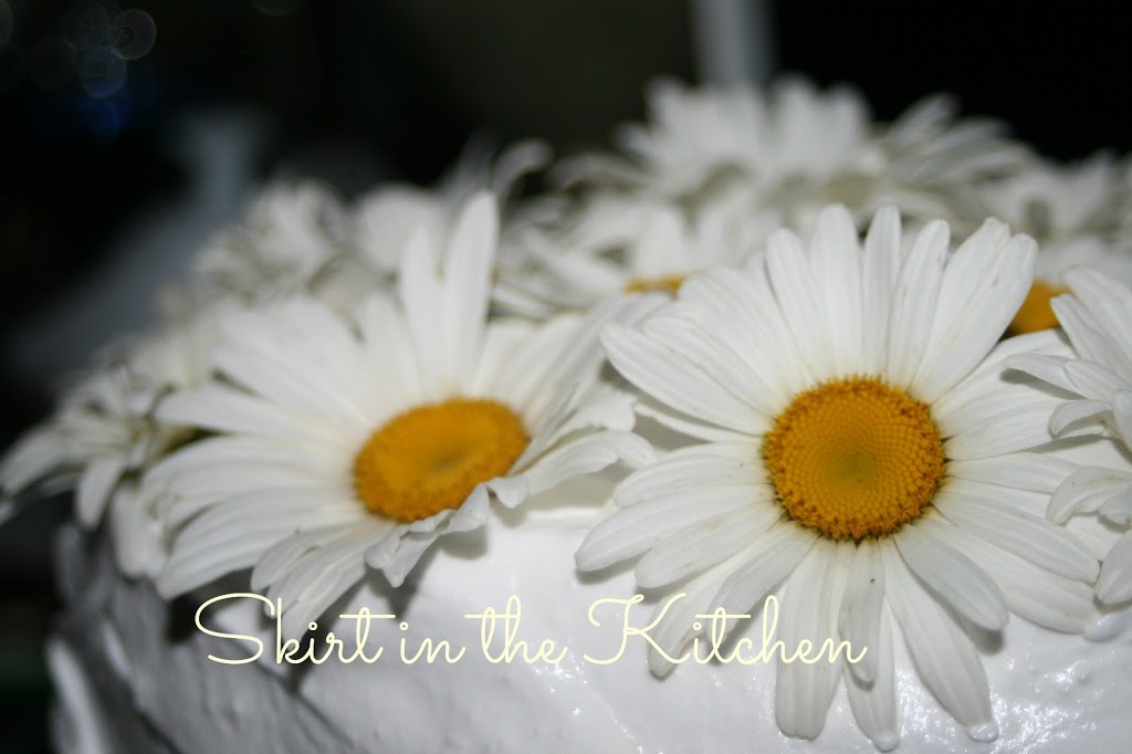 The cake batter recipe is from Cook’s Illustrated– White Layer Cake. Instead of putting in regular vanilla extract, homemade cookie dough-flavored vodka vanilla extract (‘Making Your Own Vanilla Extract’ on May 1, 2013 post, Skirt in the Kitchen) was used in the cake batter as well as in the boiled frosting recipe from Southern Living. I also exchanged the almond extract in the batter for Frontier Coconut Flavor extract. The Shasta Daisies are pesticide-free, lightly cleaned before adhering into frosting. This was fun to make and serve; moist and delicious, a must each year when the daisies are in full bloom.