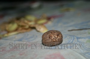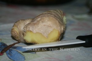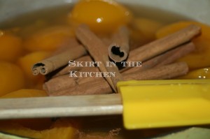 This is what I remember my parents canning with the exception of fresh ginger and chocolate mint– my additions, but it’s still theirs– and it will always be my father’s… I like doing this in the summer for winter just to have the chocolate mint inside the quart jars of canned preserves. I like to open a jar around the holidays. I sometimes cook a ham with it into a glaze or over roasted turkey. I like this for a brunch after having Hasenpheffer (November 30, 2012 Skirt in the Kitchen post). And there are times when it’s dessert in the evening. The liquid will settle into a light-creamy color. This is best when preserving already halved peaches in heavy syrup– just adding some wonderful spices after they’re heated to be sealed into jars for in the months ahead. Fresh peaches have been selected through the years, but this is when store-bought peaches are better for this; the texture, nice– and sweeter for this particular recipe. Sliced peaches will fall apart, so choose the halves. This recipe batch is for the person who barely cans, who prefers few jars preserved. But the recipe can easily be adjusted to the number of quarts desired. The basic number of quarts made are two– adjust to how many you want to make, bulking up your recipe.