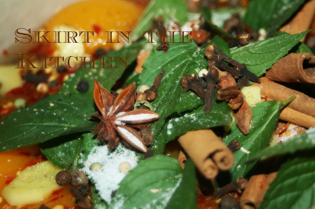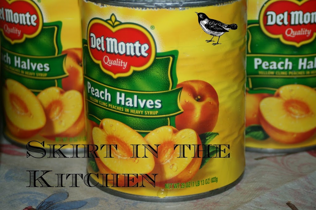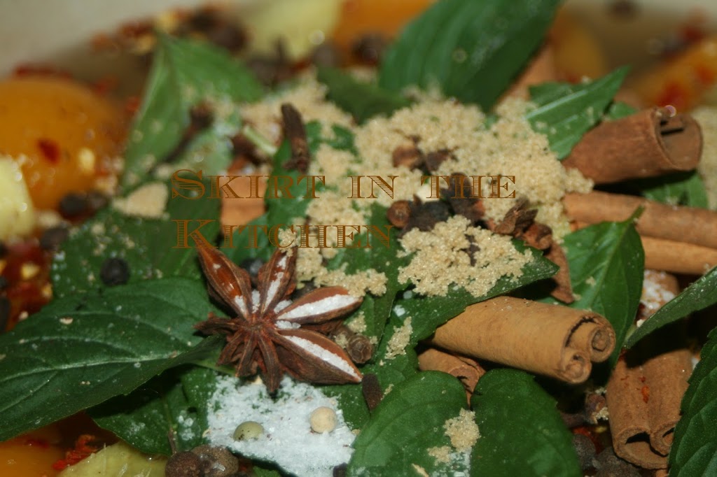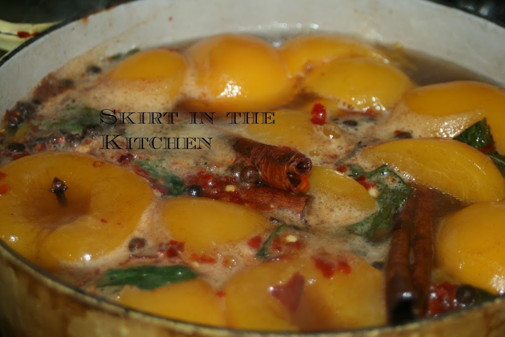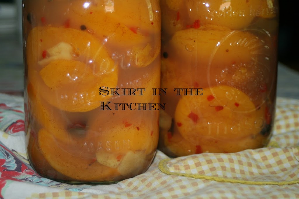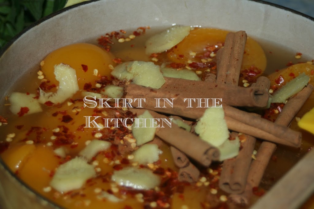 This is what I remember my parents canning with the exception of fresh ginger and chocolate mint– my additions, but it’s still theirs– and it will always be my father’s… I like doing this in the summer for winter just to have the chocolate mint inside the quart jars of canned preserves. I like to open a jar around the holidays. I sometimes cook a ham with it into a glaze or over roasted turkey. I like this for a brunch after having Hasenpheffer (November 30, 2012 Skirt in the Kitchen post). And there are times when it’s dessert in the evening. The liquid will settle into a light-creamy color. This is best when preserving already halved peaches in heavy syrup– just adding some wonderful spices after they’re heated to be sealed into jars for in the months ahead. Fresh peaches have been selected through the years, but this is when store-bought peaches are better for this; the texture, nice– and sweeter for this particular recipe. Sliced peaches will fall apart, so choose the halves. This recipe batch is for the person who barely cans, who prefers few jars preserved. But the recipe can easily be adjusted to the number of quarts desired. The basic number of quarts made are two– adjust to how many you want to make, bulking up your recipe.