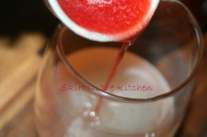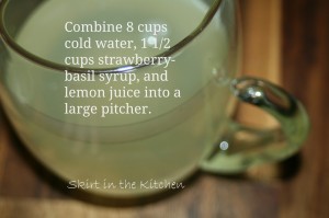 Make strawberry-basil syrup for the lemonade: Combine and heat to a boil 1 1/2 cups granulated sugar and 1 cup water. Add 1 pound strawberries in 1/2″ chunks. Reduce heat to medium-low; 10 minutes to soften berries. Remove from heat, stir in 3/4 cup tightly packed fresh basil leaves. Let rest to steep 45 minutes. Then strain through a fine-mesh sieve, discard solid matter.