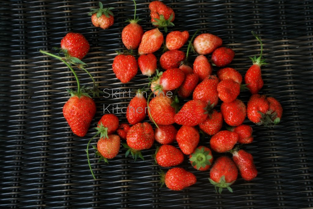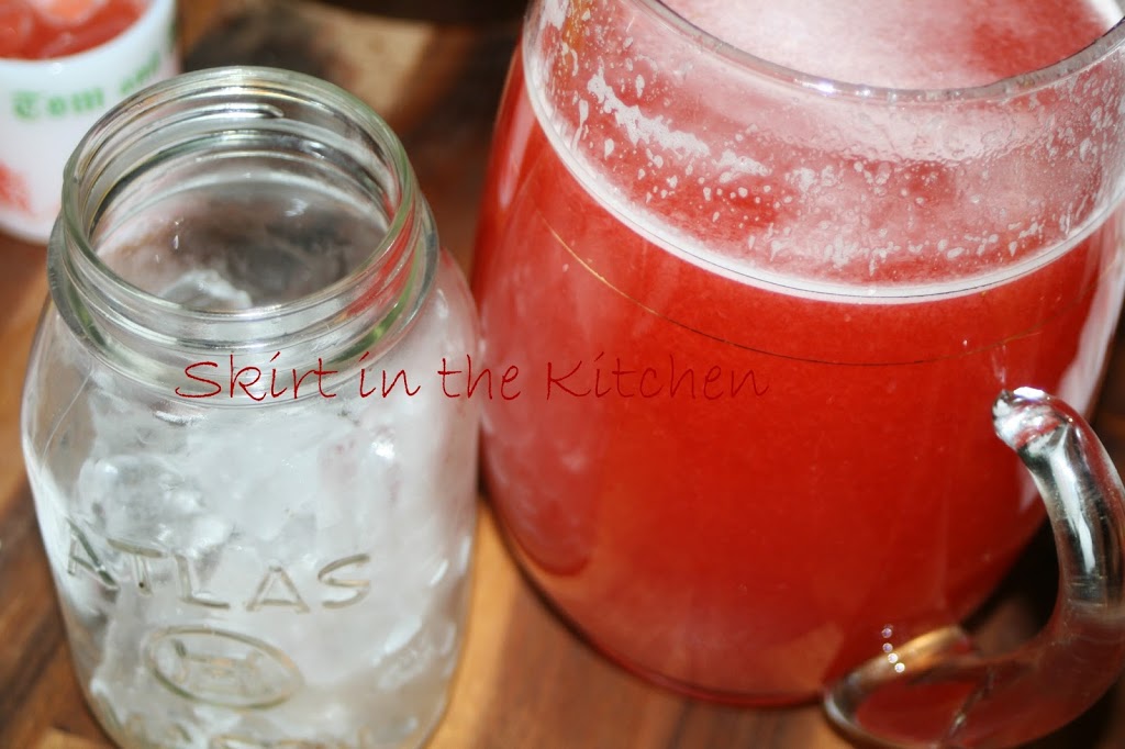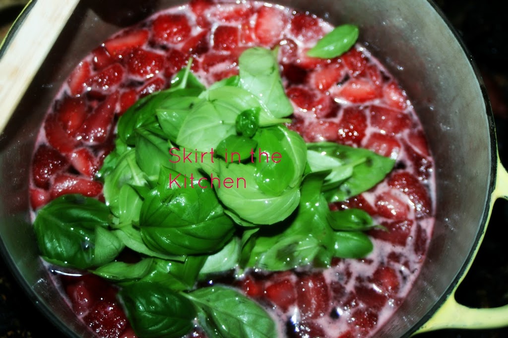 Make strawberry-basil syrup for the lemonade: Combine and heat to a boil 1 1/2 cups granulated sugar and 1 cup water. Add 1 pound strawberries in 1/2″ chunks. Reduce heat to medium-low; 10 minutes to soften berries. Remove from heat, stir in 3/4 cup tightly packed fresh basil leaves. Let rest to steep 45 minutes. Then strain through a fine-mesh sieve, discard solid matter.