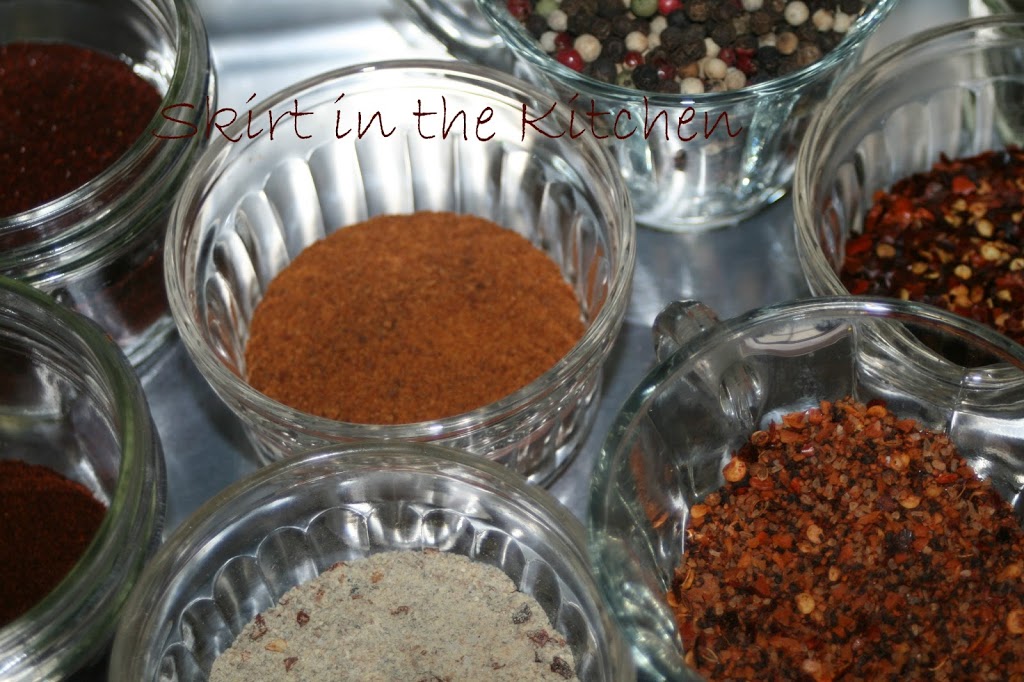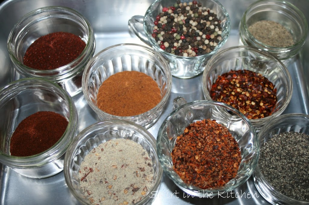 I prefer old and new, alike, so I opt for small antique jars, custard dishes, even 4-ounce canning jars– I want them each in glass form to match as far as construction goes, but a variety of them looks nice in an oblong baking pan with a lid to fit firmly before I stash it in its appropriate place when I’m not reaching for a hot pepper spice for chili, slow-cooked pulled pork or simply for a good hamburger patty to fry.