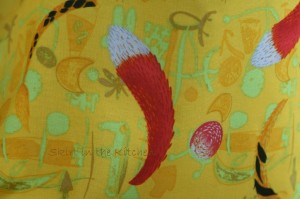 It’s a medium linen cotton, sturdy, and it will give a plume effect like a 50’s skirt when gathered. I got this fabric a year ago, marked down at the time of purchase. I do this: I buy material and put it away for whenever I will eventually find a use for it. This print is abstract with cat tails, cat ears, and anything feline. It’s just right for my kids’ room that they play in and create the strangest of things in that is artful and imaginative, the cat-lovers that they are.