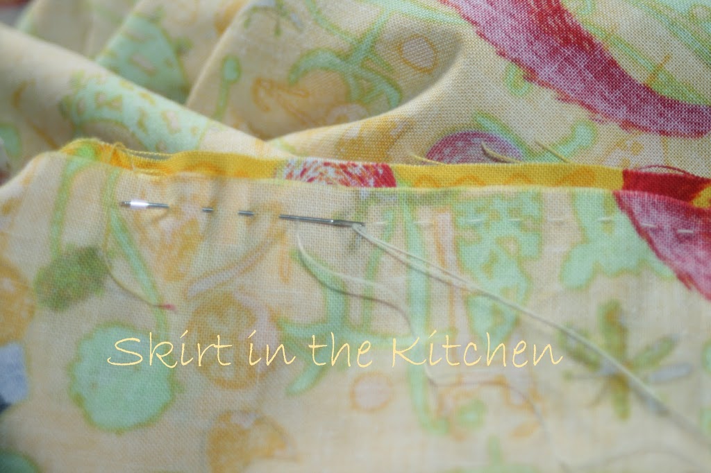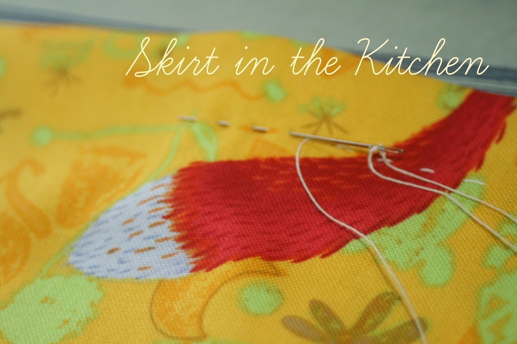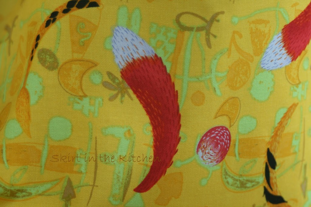 It’s a medium linen cotton, sturdy, and it will give a plume effect like a 50’s skirt when gathered. I got this fabric a year ago, marked down at the time of purchase. I do this: I buy material and put it away for whenever I will eventually find a use for it. This print is abstract with cat tails, cat ears, and anything feline. It’s just right for my kids’ room that they play in and create the strangest of things in that is artful and imaginative, the cat-lovers that they are.