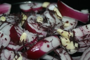 Slice 1 red onion and 3 garlic cloves; place in the bottom of a crock pot with a portion of the dried Hibiscus petals.