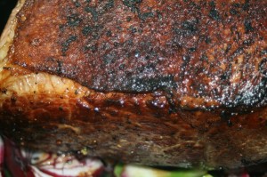 Place and lay over the first ingredients, fat side-up, a beef roast seared in olive oil (seasoned before searing with coarse salt and freshly ground black pepper).