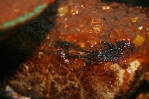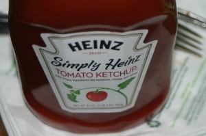 Add 1 complete bottle, 34 ounces, tomato ketchup–the final ingredient (after the meat has been thoroughly cooked).  The liquid will thicken, the sauce be the right consistency with the accumulation of a built flavor of this barbecue– outstanding.  This is totally summer, a unique kind of barbecue sauce, and it’s even better the next day.