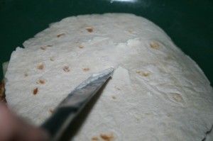 To make a quesadilla, butter a tortilla side to fry on a hot skillet.