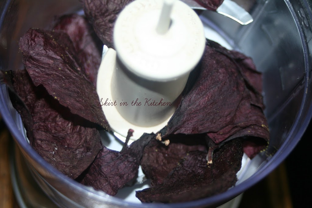 They will darken to a maroon color when dried.  Process into fine or small particles and measure 1 cupful.