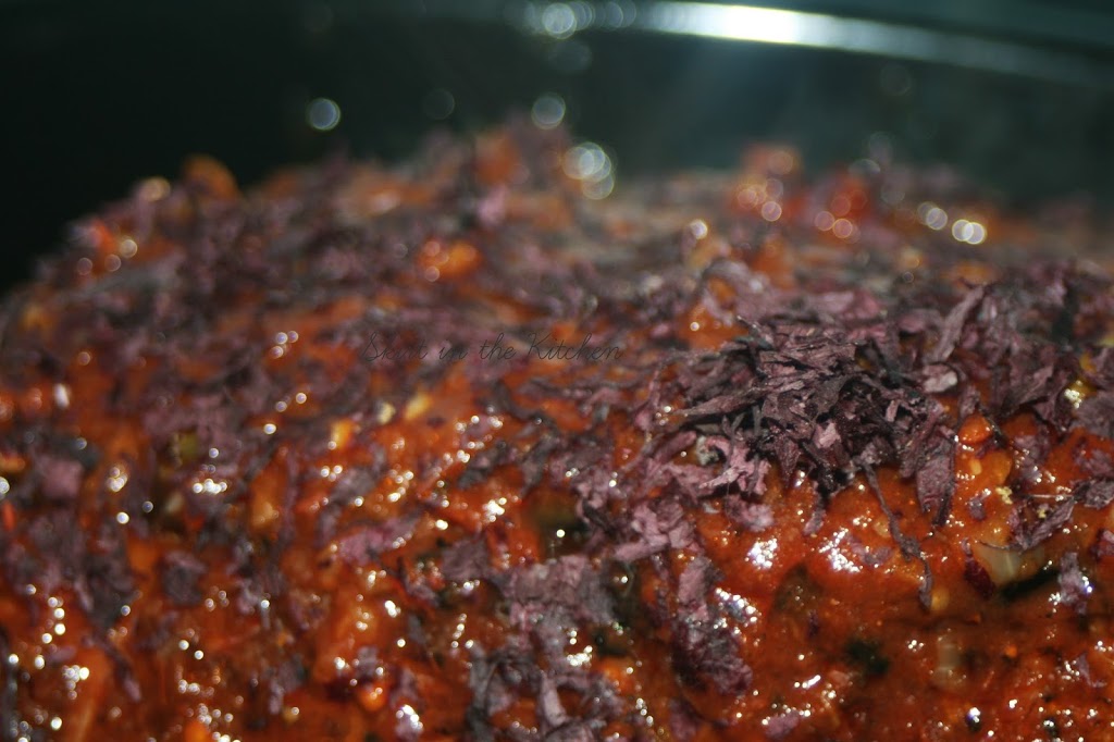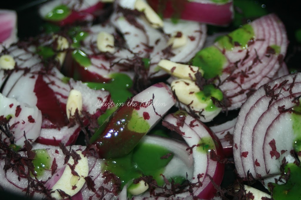before pouring all of it over the meat.  Top with minced red onion, 2 minced garlic cloves,