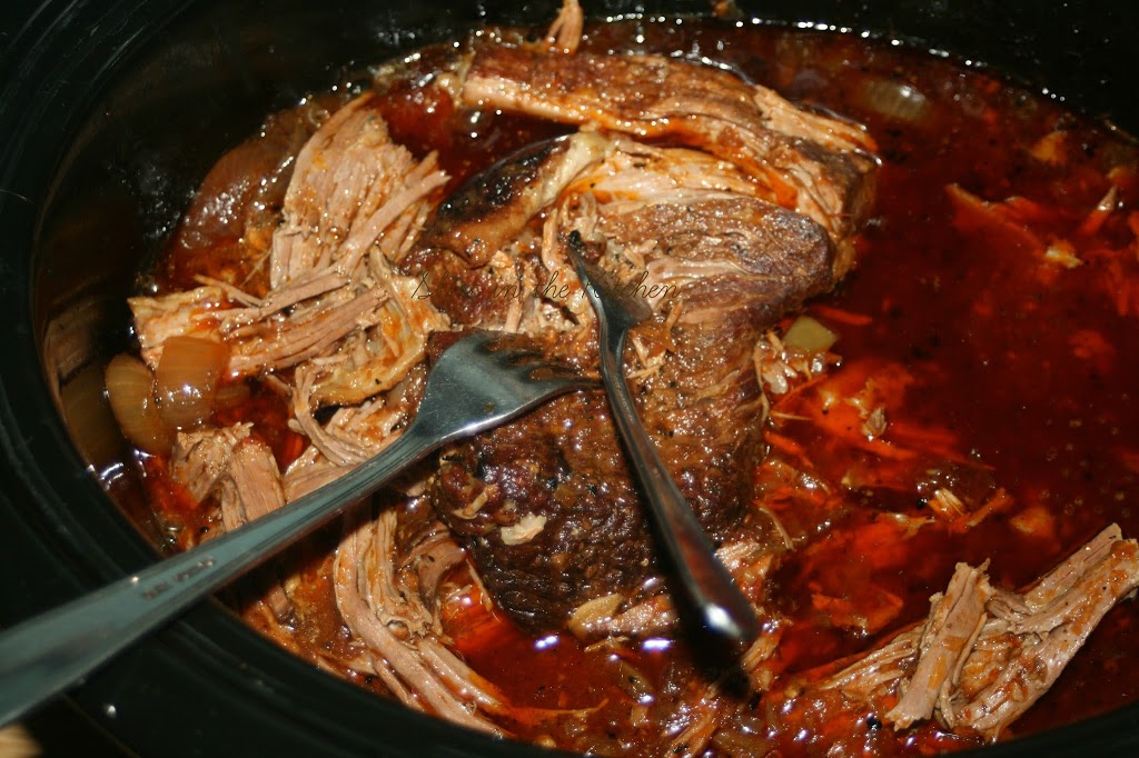 Tear the meat and remove the fat.  (The fat is needed for moistness and flavor while cooking.)  There will be a fair amount of liquid in the crock pot.
