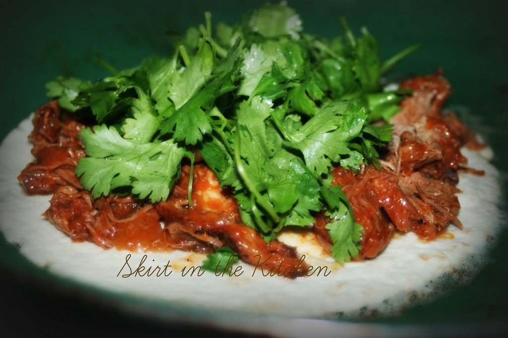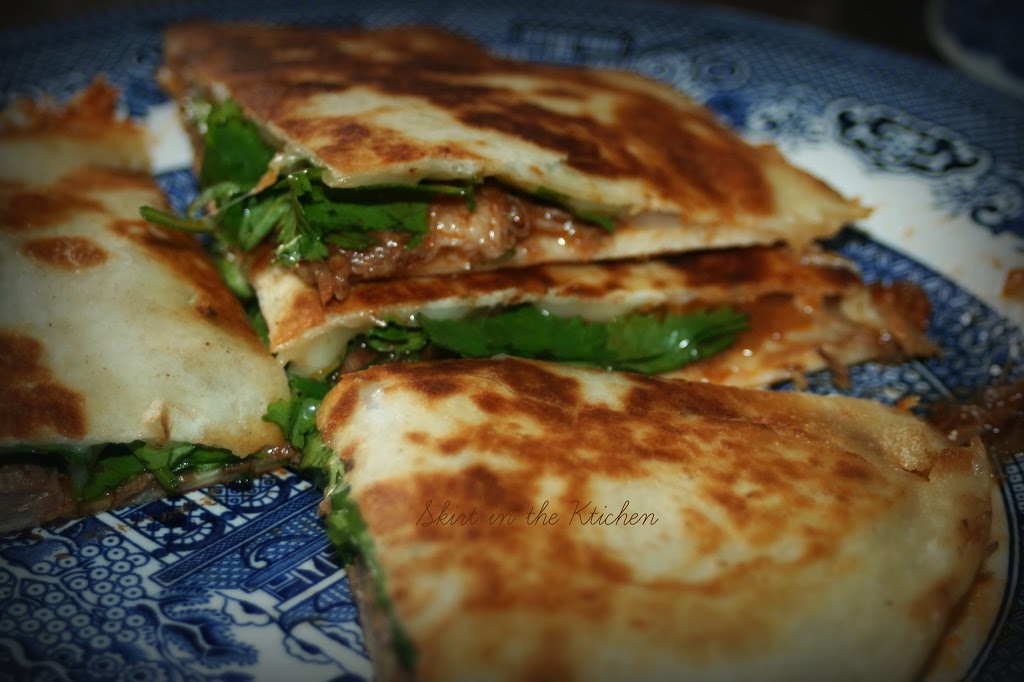 Place the meat and cilantro, and preferably pepper-jack cheese.  Butter a top, lay, quickly flip to brown, then cut and serve.