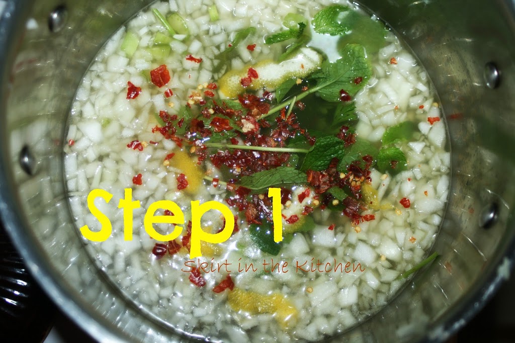 In a medium saucepan, combine 1 coarsely chopped onion, 1 coarsely chopped celery stalk, 3 crushed garlic cloves, 4 parsley sprigs, 4 mint sprigs, 2 pieces of lemon zest, 1/4 to 1/2 teaspoon crushed red pepper, 3 quarts chicken stock, and 1 whole chicken cut into parts.