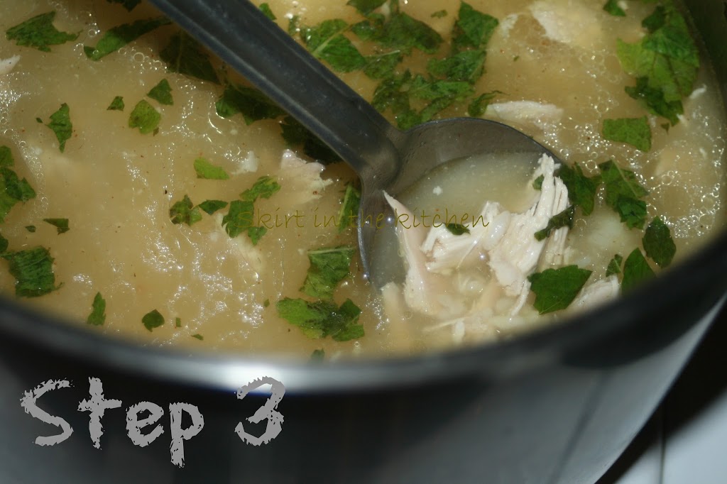 Discard vegetables and herbs; transfer the chicken to a plate to cool before cutting into bite-size pieces. Strain stock through a fine sieve. Return stock to the pot, adding chicken pieces, 2 tablespoons lemon juice, and 1/4 cup rice. Before serving, if desired, add more mint and crushed red pepper flakes. Salt and pepper accordingly.
