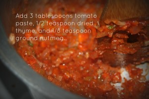 Heat 2 tablespoons olive oil in a large saute pan over medium-high heat.  Add the following:  4 cloves minced garlic, 1 large finely chopped carrot, 1 finely chopped celery stalk, 1 finely chopped onion, salt and pepper.  Cook for 3 minutes.