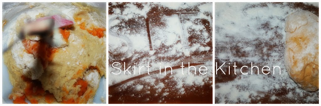In 2 packages of active dry yeast, add 1 tablespoon sugar, and 1/2 cup warm water. Stir, allow to rest for 5 minutes. Add and incorporate 1/4 cup minus 1 tablespoon sugar, 3 tablespoons slightly cooled and melted unsalted butter, 1 tablespoon salt, and 2 whisked eggs. One cup at a time, stir in 3 to 3 1/2 cups bread flour, then 1/2 cup cooked mashed sweet potato. On a lightly floured board, knead dough 2 or 3 minutes; add a little more flour if needed. Be careful not to add too much flour.