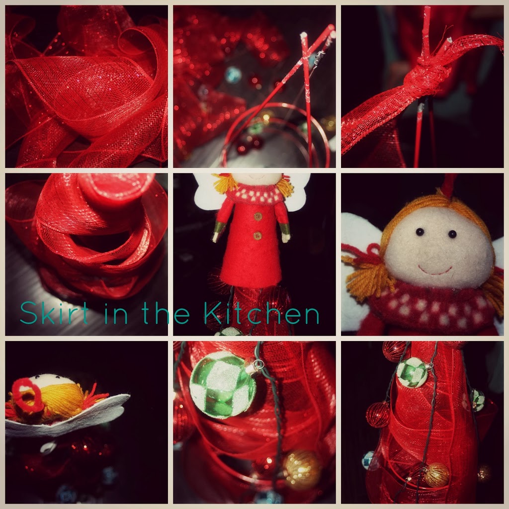 Choose mesh, particularly– a wire mesh, 2 full coils/rolls. Begin at the top of the tomato cage you have left from your summer garden. Bend the 3 prongs inward, meeting at the top. Make a knot around the wire points. Wrap around the cage, going from top to bottom, around the sides, holding it securely with each wrap. Go through the cage, as well, bringing it back up to the top. Line with a string of lights horizontally, ever which way; criss-crossing them makes a snugger fit in holding everything together. Any tree topper will do fine. This one is for my children’s craft room. Am I always in here if not often?– The answer is: Yes.