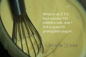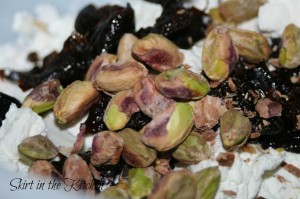 Mix together 9 ounces/250 grams plain flour, 5 1/2 ounces/150 grams soft goat’s cheese in small pieces, 3 1/2 ounces/100 grams prunes roughly chopped,