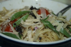 ~ adapted from Martha Stewart ~This is quick and easy (and good), just right for summer.In one pot, throw in 12 ounces linguine, 2 cups thinly sliced onion, 3 cloves garlic thinly sliced, 12 ounces grape or cherry tomatoes, 1/2 teaspoon red pepper flakes, salt and pepper, 4 1/2 cups cold water, and sprigs of basil.Bring to a boil, then a simmer 'til al denté. … [Read more...]