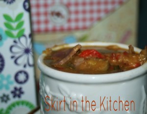 ~ Skirt in the Kitchen ~With ham left over from a large ham roast, pour 3 32-ounce containers of chicken broth over ham one in a large pot. Slice 1/2 of a large red onion and add black pepper.Season with fresh tarragon and thyme, smoked Hungarian paprika, and creole seasoning.Chop and add 5 scallions.Clean and slice 8 fingerling potatoes. Chop and add peppers: … [Read more...]
