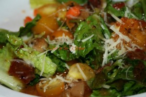 ~ Skirt in the Kitchen ~Salad ingredients: Romaine lettuce, curly parsley, golden cherry tomatoes, red onion, carrots, homemade croutons, grated Parmesan.For the croutons: Cube white Italian bread, drizzle with olive oil, add garlic salt and dried parsley; cook at 450 degrees and toss halfway through browning.My father's dressing:There are no measurements for the … [Read more...]
