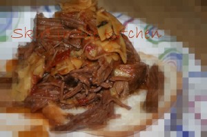~ Skirt in the Kitchen ~Salt and pepper all sides of a rump roast-- fat-side up, lay in the bottom of a crock pot with 1 inch beef broth. Over the top of the roast, douse with red wine vinegar and ketchup. Add sliced red onion, 2 tablespoons chunked butter, chilies in Adobo sauce including a small amount of the sauce, 2 cloves finely chopped garlic, and 1 can … [Read more...]