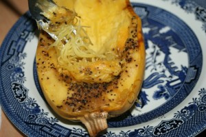 Spaghetti Squash with Sausage~ adapted from FN ~Halve 1 2-pound spaghetti squash, scoop out seeds. Cut-side-up, place the squash in a microwave-safe bowl; drizzle with 1 tablespoon olive oil and 1 tablespoon water per portion. Season with salt and pepper. Cover with plastic wrap, microwave until tender, about 20 minutes. Drain the liquid, shred flesh of … [Read more...]